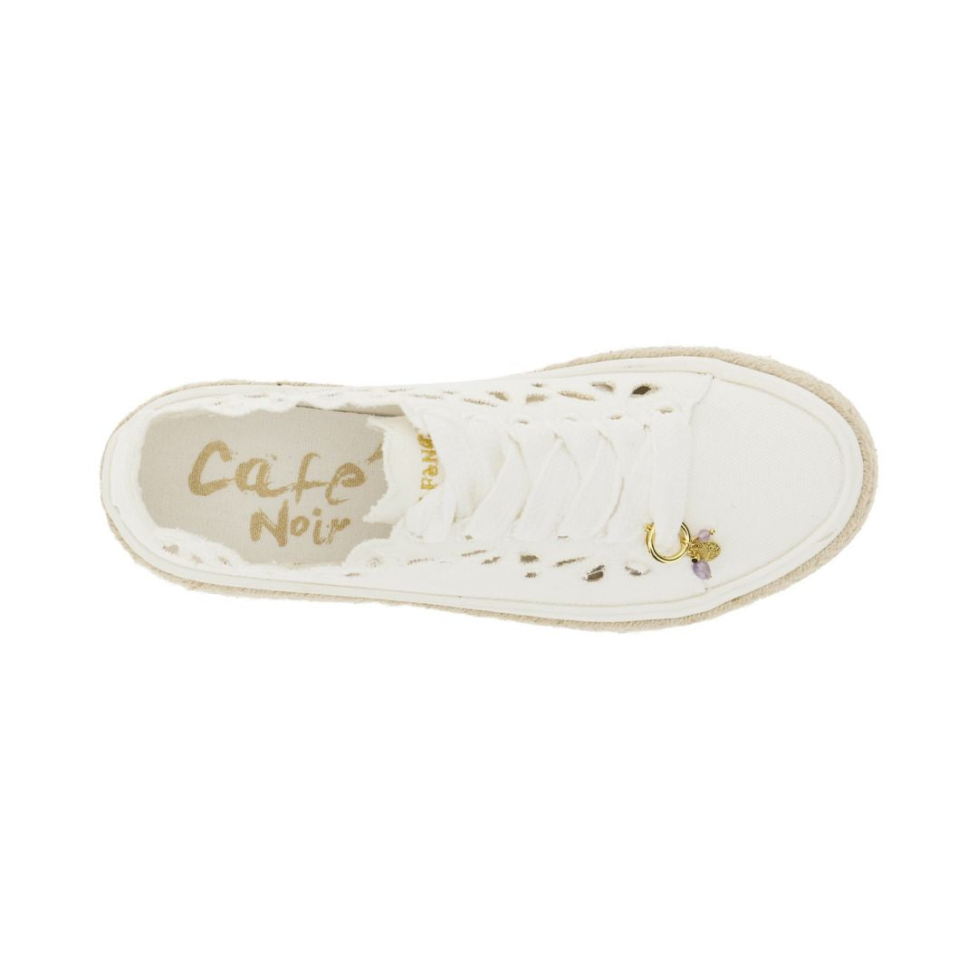 Sneakers allacciate da donna in tessuto traforato con profili smerlati e lacci maxi in cotone in tono. dettaglio charm gioiello e zeppa in corda intrecciata alta 4 cm.