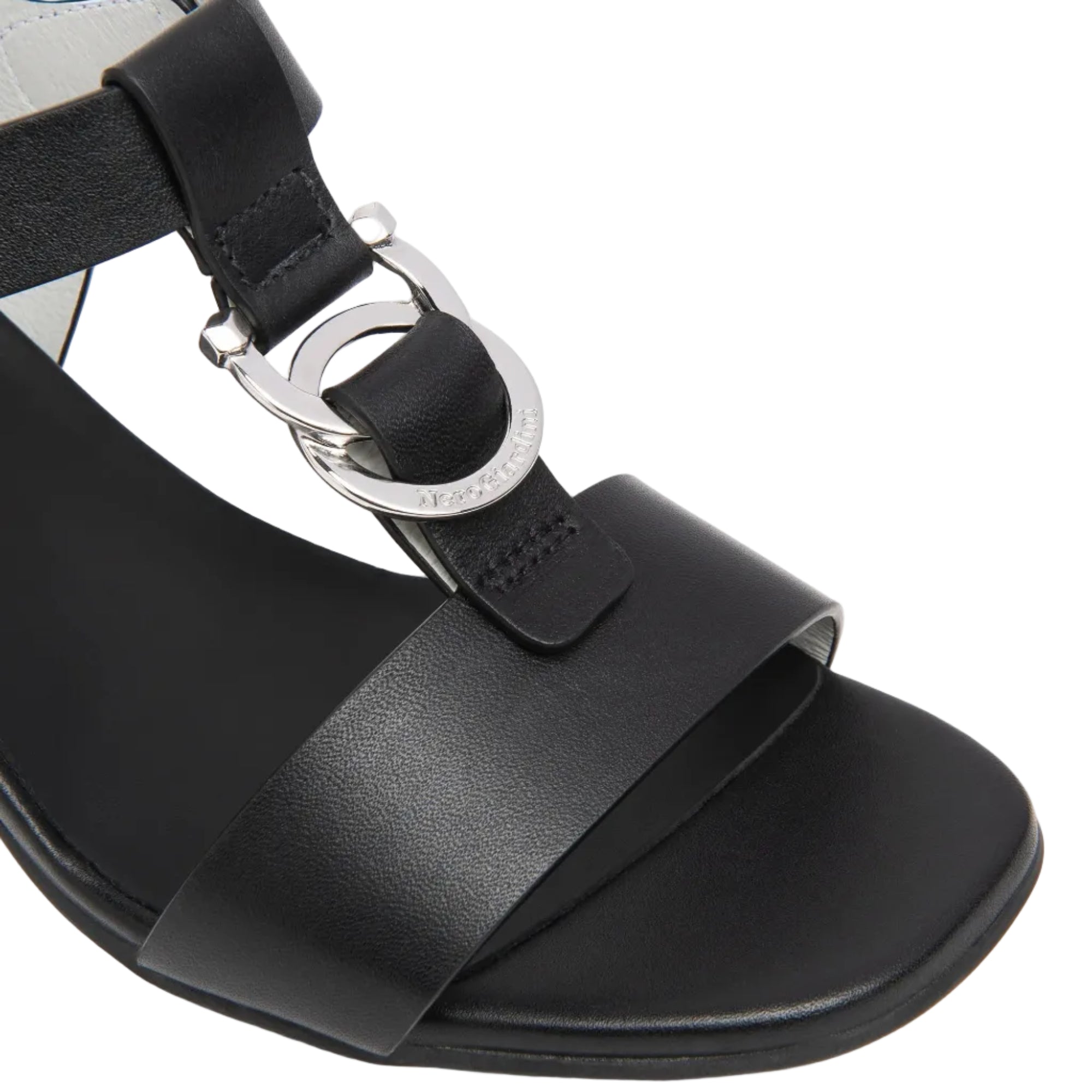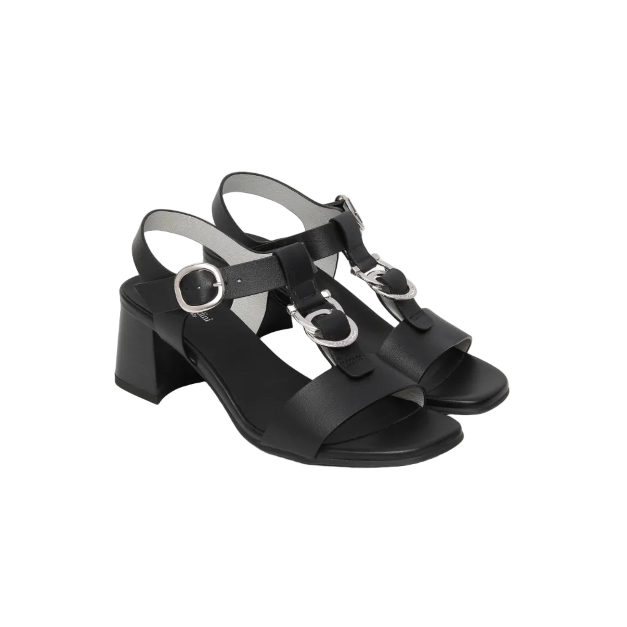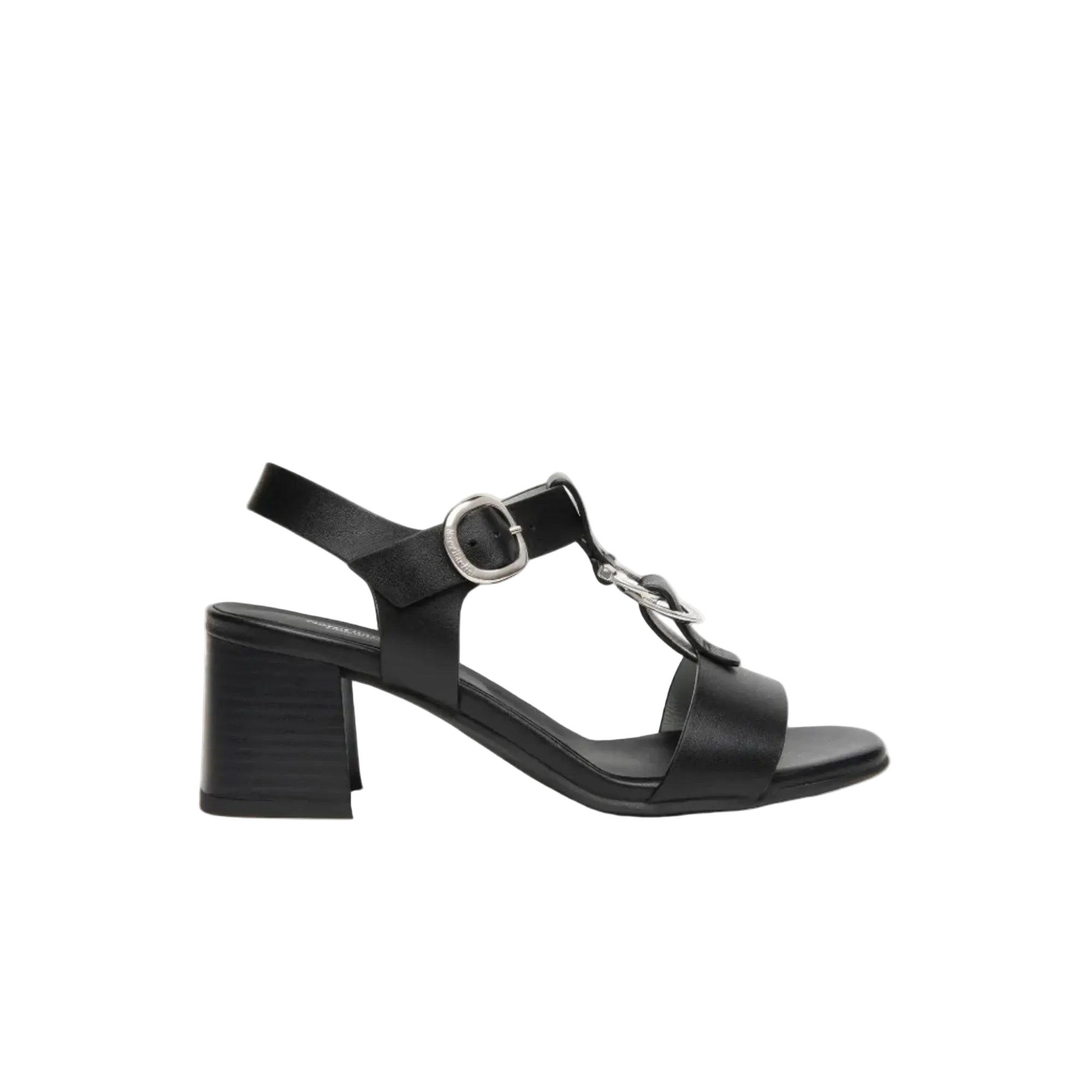 Sandali con tacco medio in pelle con accessorio, chiusura cinturino con fibbia, fondo in gomma. Altezza tacco...