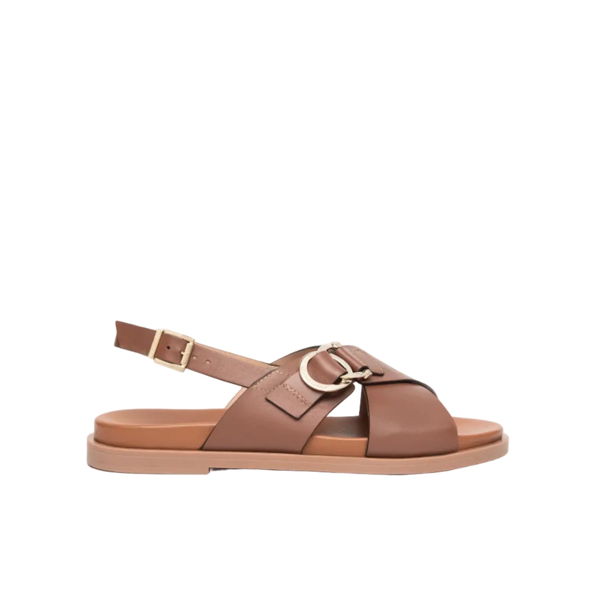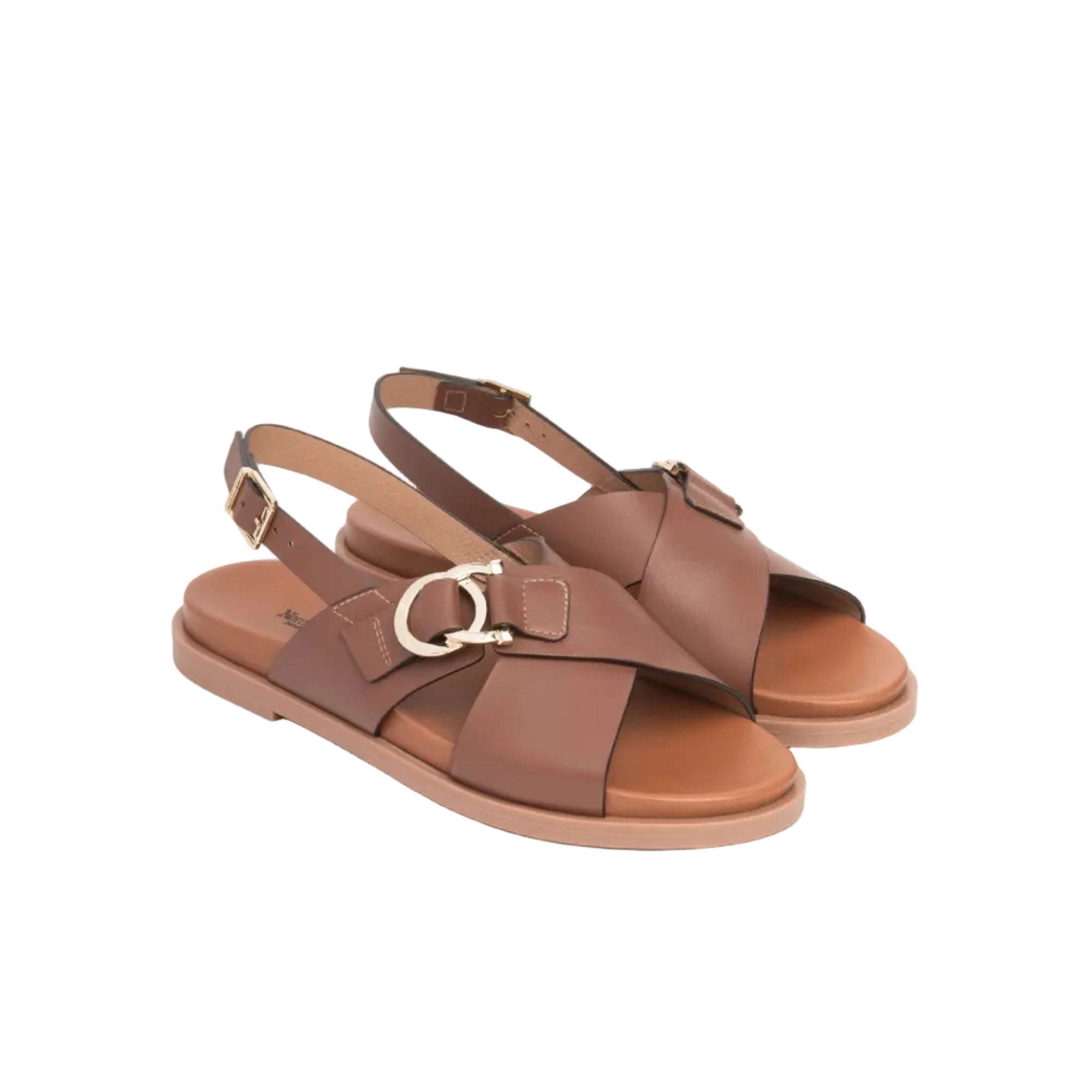 Sandali incrocio in pelle, chiusura regolabile con fibbia. Fondo in gomma 1,5 cm.