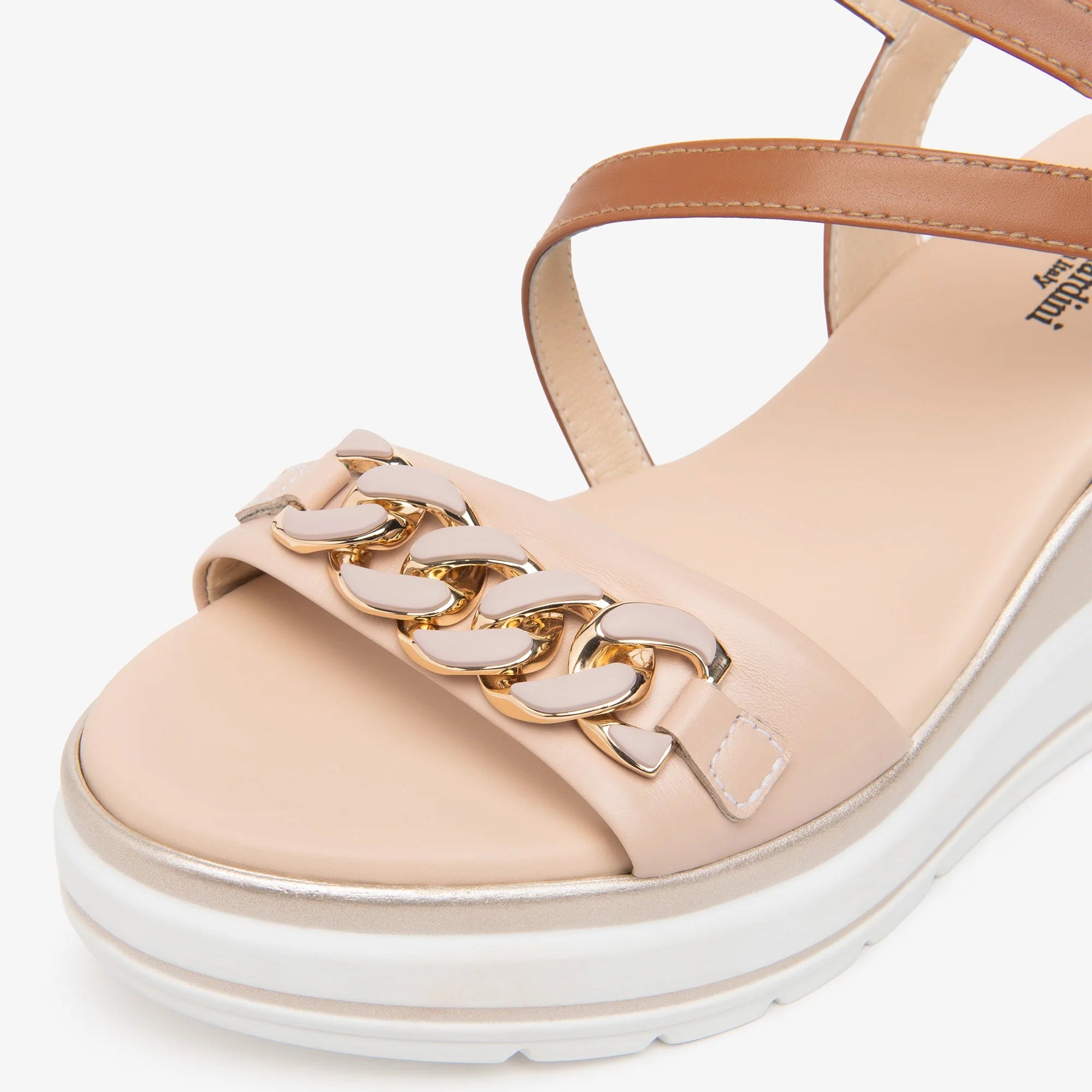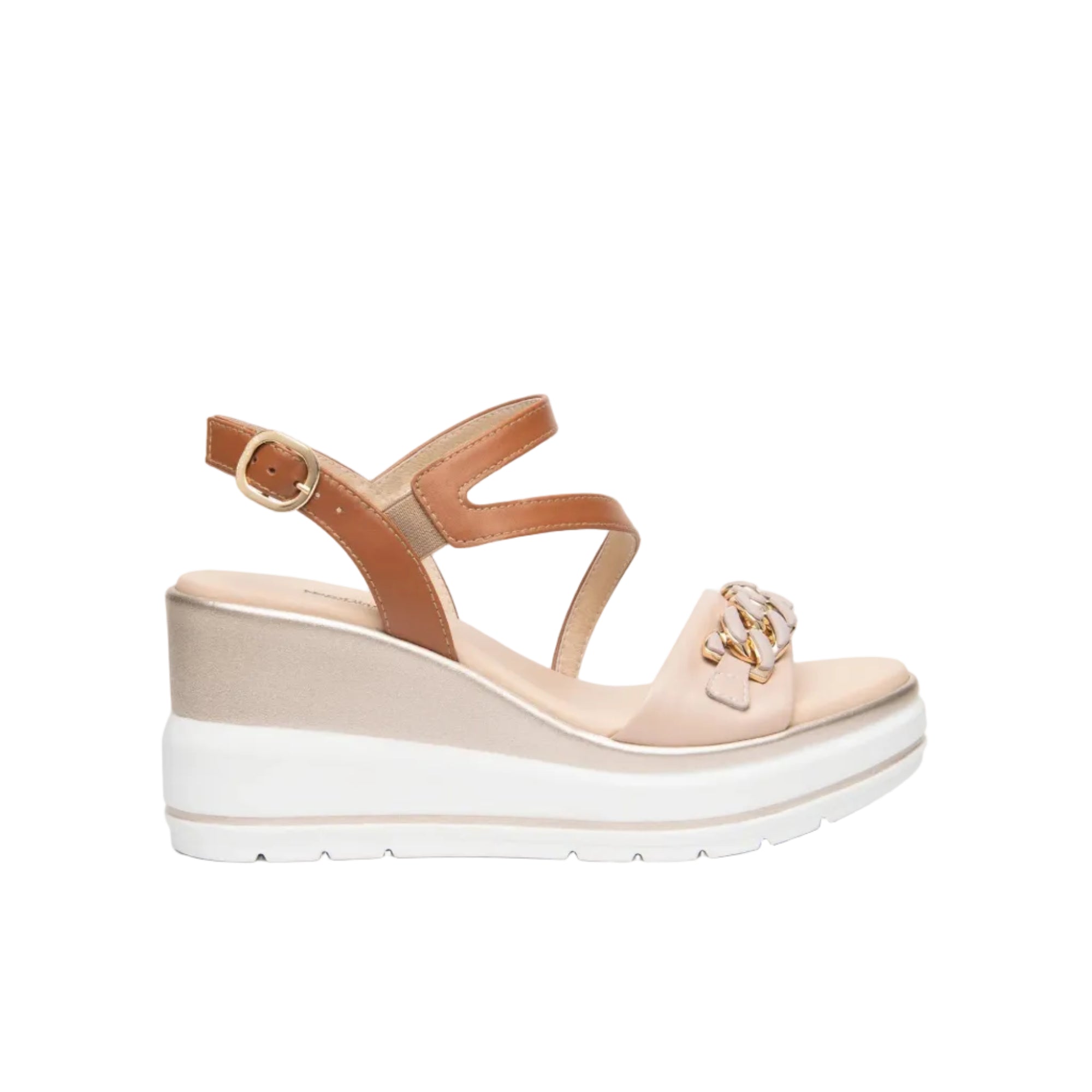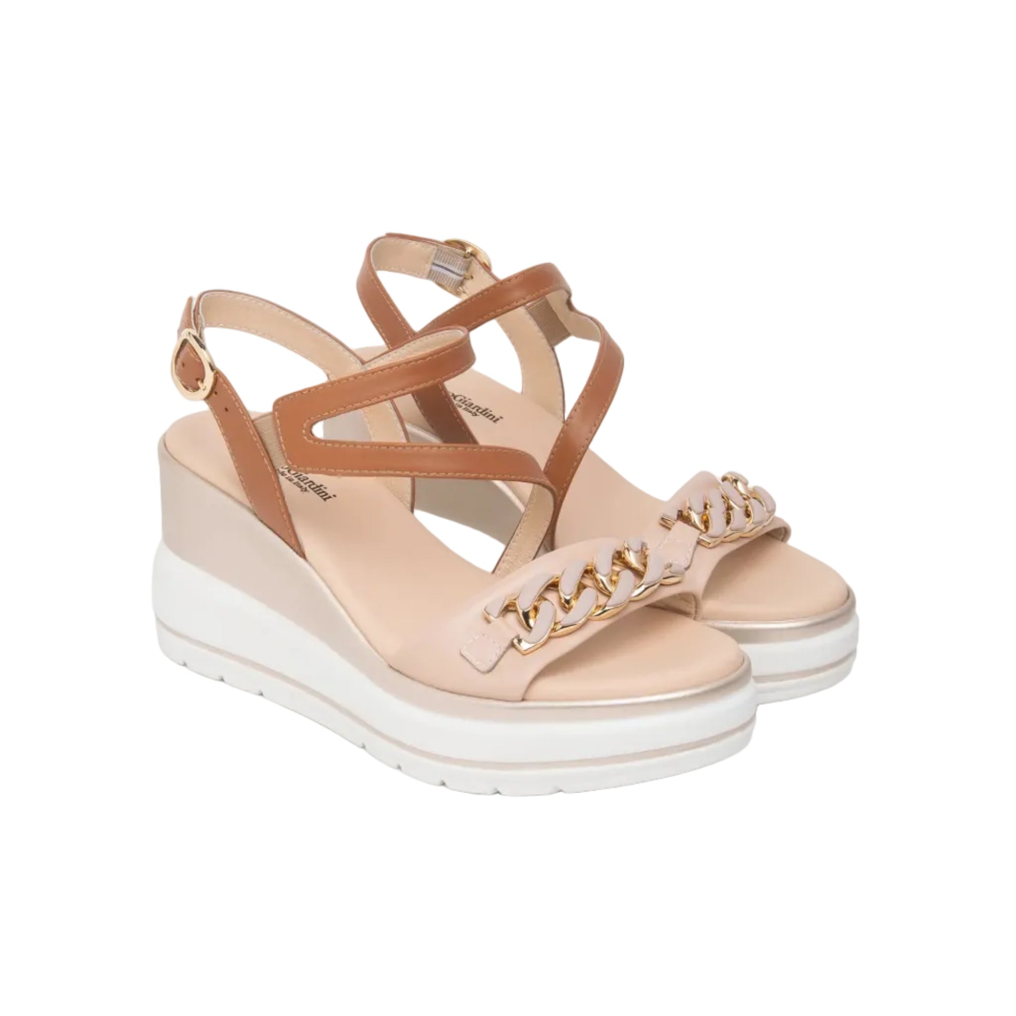 Sandali con zeppa e comodo plateau, realizzati in pelle colore cipria e cuoio, accessorio catena, cinturino regolabile con fibbia. Altezza fondo 7,5 cm.