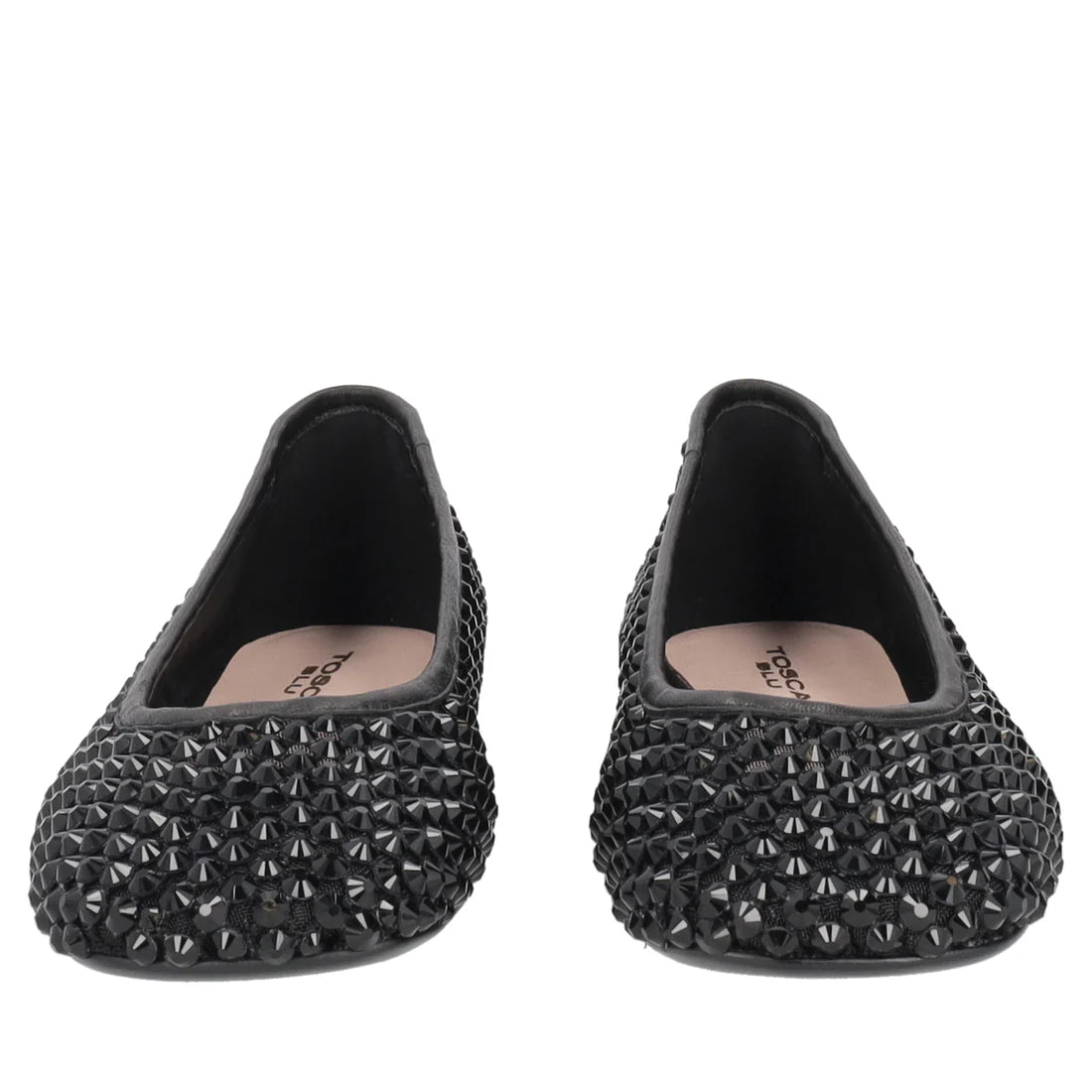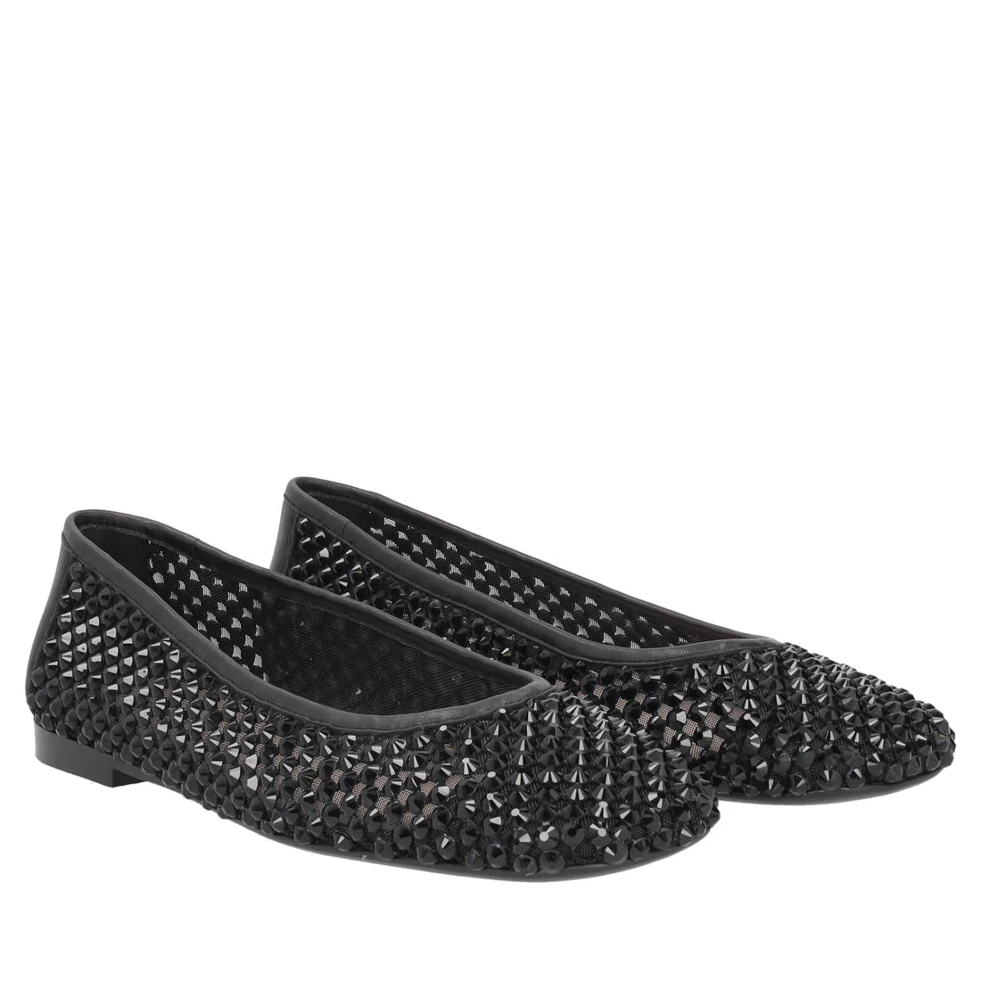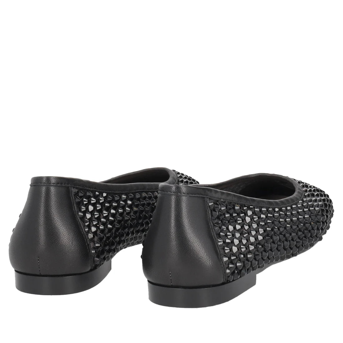 Ballerine con strass colore nero, impreziosite da una sofisticata lavorazione a rete e da una pioggia di cristalli luminosi che ricopre l'intera tomaia. Il modello è rifinito da un raffinato tallone con texture a contrasto, che dona struttura ed eleganza alla silhouette.